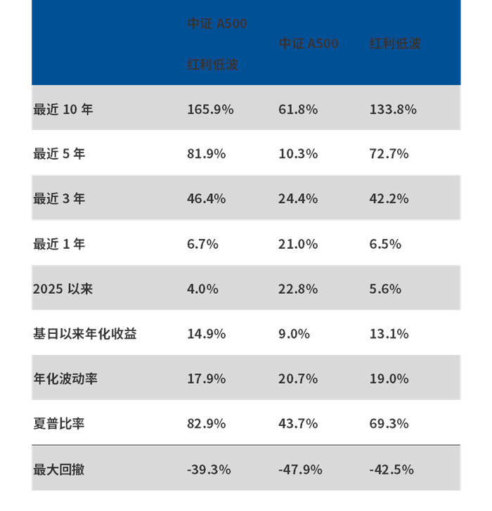 从长期业绩来看,这种“细分龙头+红利+低波”的策略效果显著。数据显示,自2013年底基日以来,中证A500红利低波指数的年化收益率达到了14.9%,不仅跑赢了母指数中证A500,也优于传统的红利低波指数。特别是在近10年的维度上,其累计收益率达到了165.9%,远超同期红利低波的133.8%。它在保持了高夏普比率的同时,最大回撤也控制得更好。